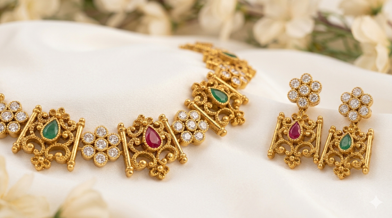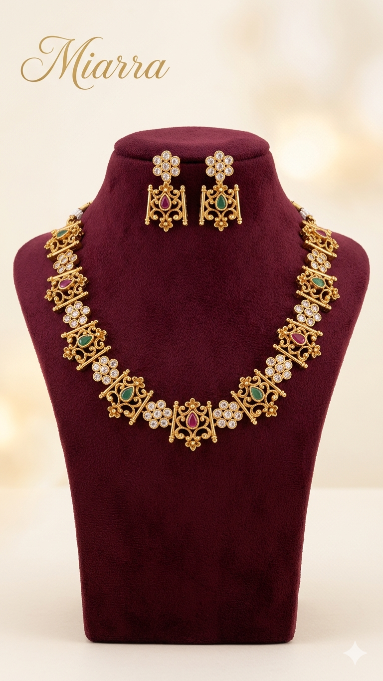 Inspired by traditional temple jewelry, this elegant necklace set features intricate antique detailing with a beautiful combination of ruby pink and emerald green stones. The design showcases finely crafted square motifs with delicate carvings, highlighted by sparkling American diamonds for a rich and timeless appeal.