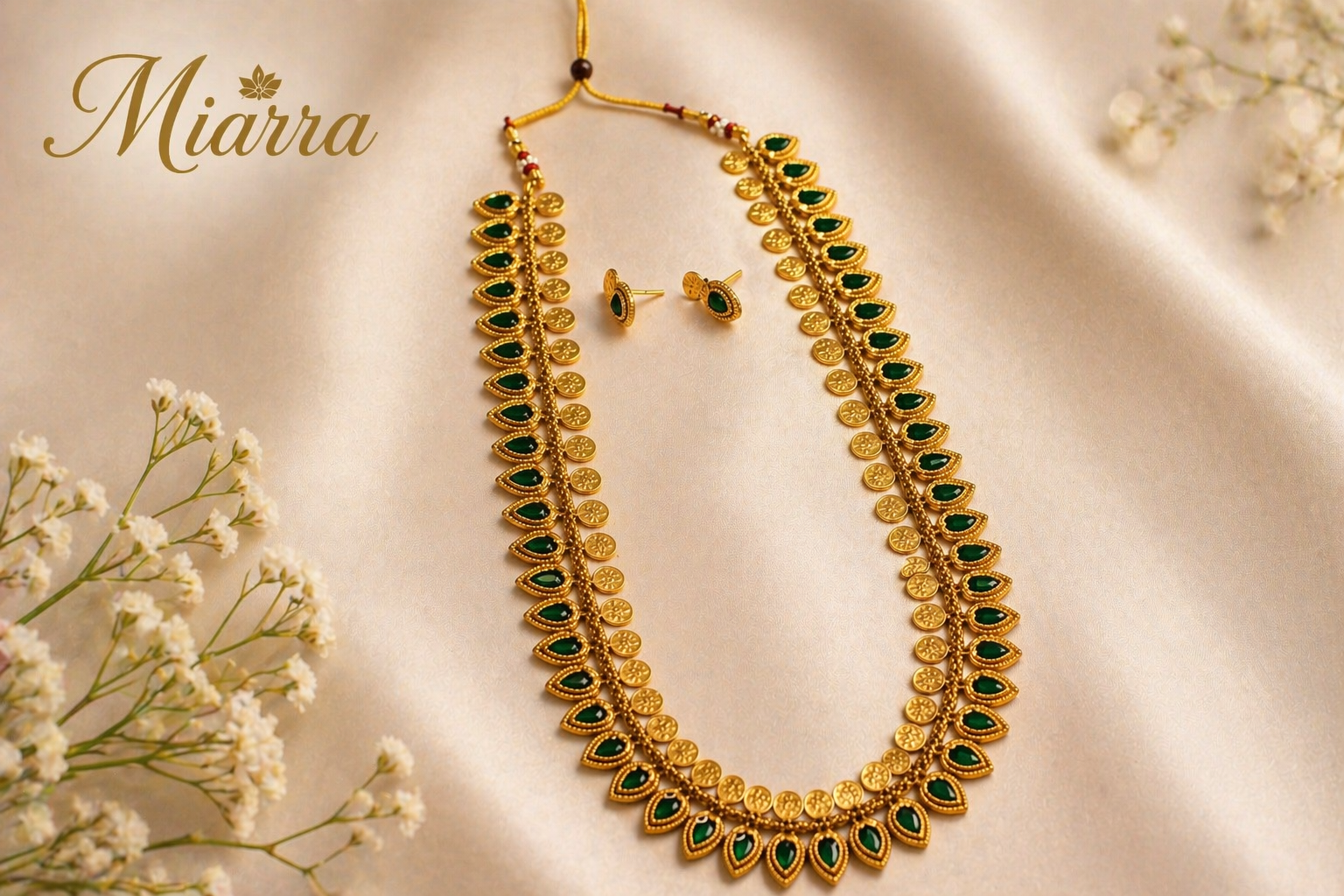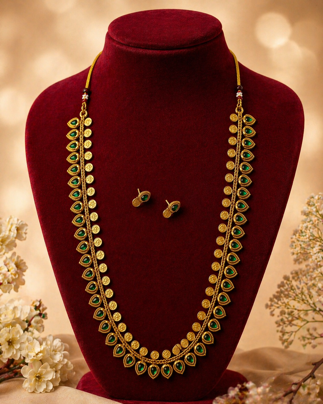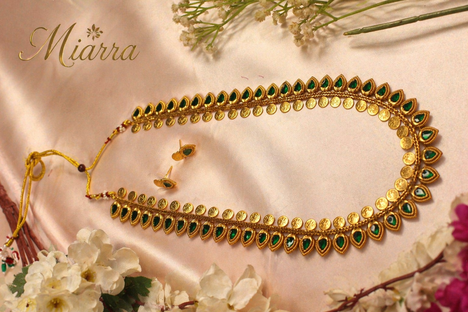 A timeless expression of tradition and elegance, the Emerald Coin Cascade Haram features a beautifully elongated silhouette with graceful curves that drape effortlessly. Intricately crafted gold coin motifs are paired with rich emerald-toned teardrop accents, creating a rhythmic flow of heritage and luxury.